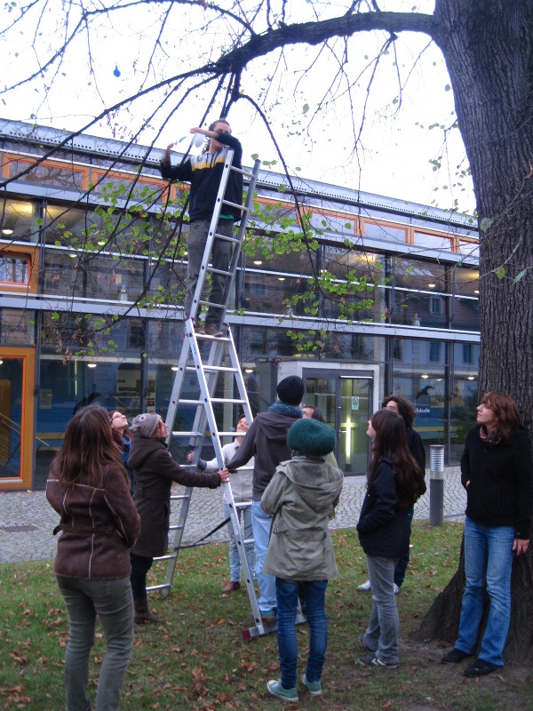 gemeinsames Abhängen von Luftballons von den Bäumen