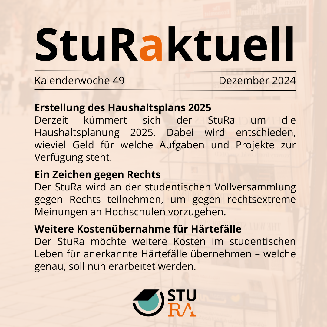 Sie sind hier: Startseite / Studentinnenrat / Referate / Referat Öffentlichkeitsarbeit / Bereich Publikationen / StuRaktuell / 2024 / 49 / Bild Zusammenfassung StuRakuell KW 49 2024