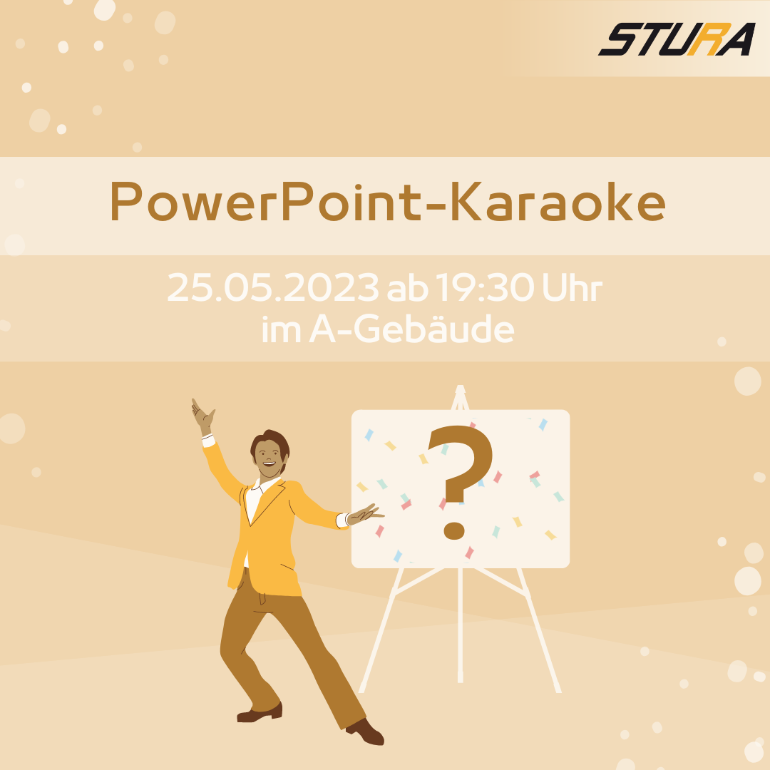 Sie sind hier: Startseite / Studentinnenrat / Referate / Referat Öffentlichkeitsarbeit / Bereich Social Media / einzelne Beiträge / 2022/2023 / PowerPoint-Karaoke Sommersemester 2023