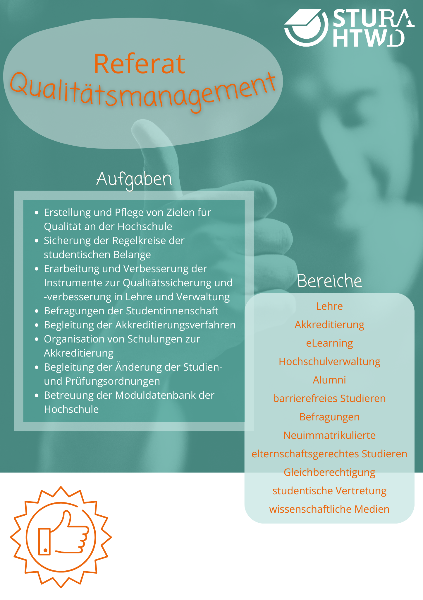 Wir begleiten die Einrichtung eines Systems zur Sicherung der Qualität der Arbeit unserer Hochschule. Bei der Evaluation beginnt es mit den Grundsätzen, geht über die Mitwirkung führt bis zur Durchführung, die wir mitbestimmen. Besonders die Qualität der Lehre ist in regelmäßigen Zeitabständen zu überprüfen. Aber auch der Service der Verwaltung oder die Vertretung durch die studentischen Organe stellen Größen dar.
